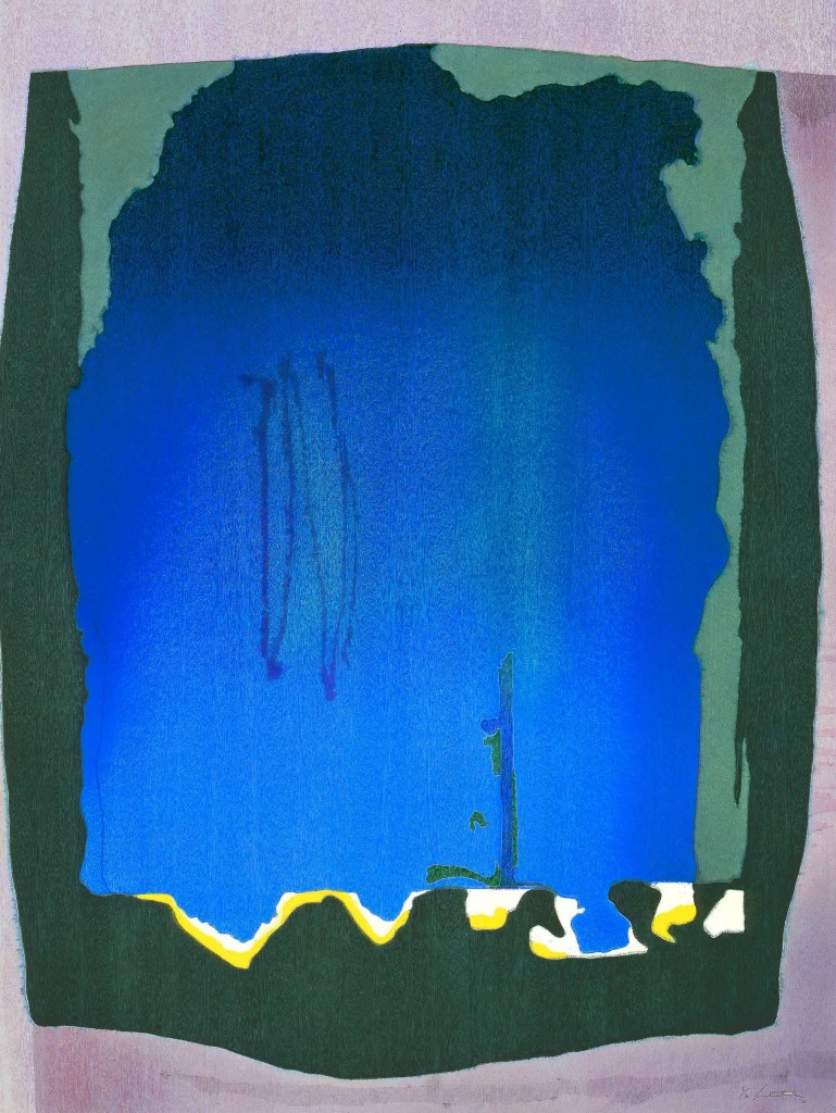 When it comes to abstraction, I tend to like pictures that are overflowing with color from edge to edge. That’s just me I guess. But Frankenthaler herself seemed to more frequently fill her pictures with color as her career progressed into the later 50s and beyond. (It’s possible that switching from oils to acrylics – not mentioned by the author but by one reviewer of the book – had an effect on this.) Inspiring and beautiful examples include “Acres” (1959, shown below), “Genuine Blue” (1970, shown below), “Sesame” (a serigraph print, 1970), “Royal Fireworks” (1975), “Circe” (1974) and “Freefall” (woodcut, 1992, shown below). I will happily gaze at these later pictures and categorize the earlier, less satisfying ones as juvenilia.