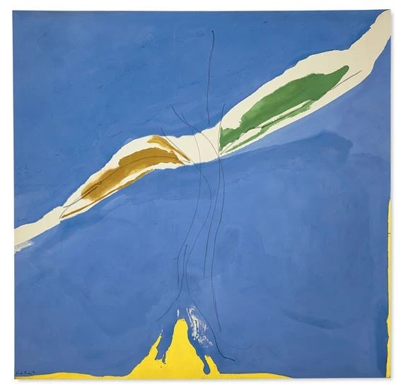 Something in her pictures implies that color is a force, as if the painter must commit to it as a full-on saturation of the canvas, a power that all but dyes itself on the eye, if it is to have any reason for being there at all. The blazing yellow and aquamarine of “Acres”, another painting of 1959, not to mention its royal blue and red, explode upon the viewer as if the artist were not only committed to their intrinsic beauties but feared that anything less than such a deep-dyed commitment would allow an unspecified but horrible night to return.