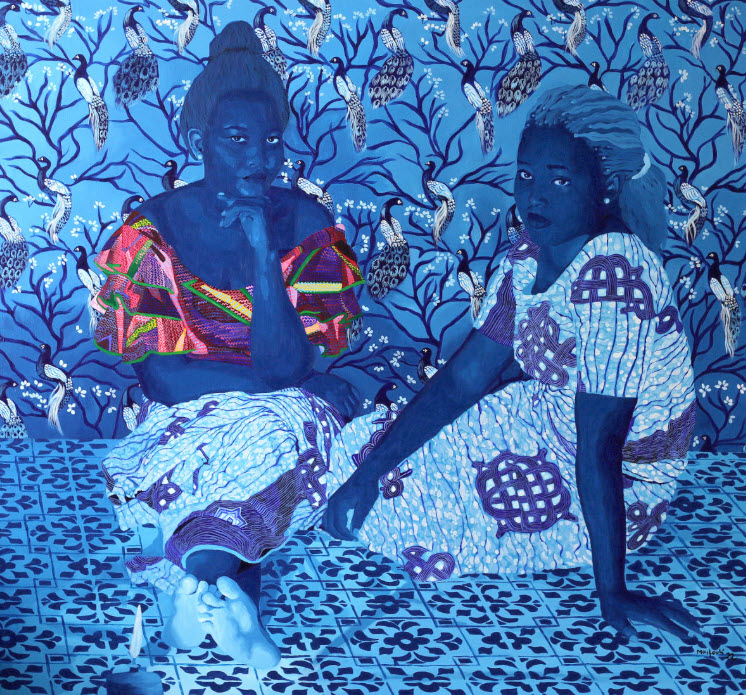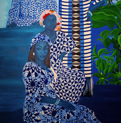 “Bello draws inspiration from Yoruba culture to create portraits of powerful women who embody peace, purity and healing. The color blue predominates in her works. She belongs to the Yoruba ethnic group who dye their fabrics blue from an indigo plant. This color is associated with benevolence, security and home.”